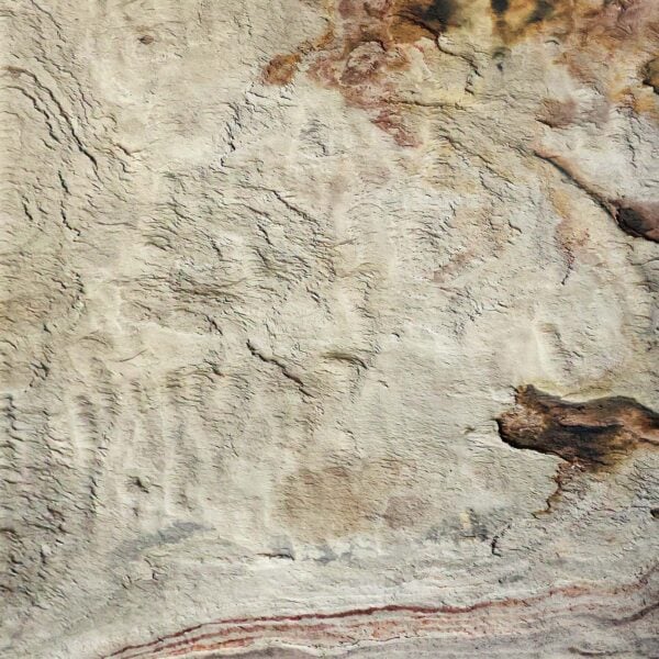 A dramatic canvas of nature’s artistry. Its pale, off-white base serves as a backdrop for dramatic swirls and patterns in varying shades of tan, brown, and rust. These fluid formations evoke images of windswept deserts or the sinuous lines of topographical maps. The striking contrast between the light background and darker swirls creates a bold, eye-catching appearance that commands attention.
